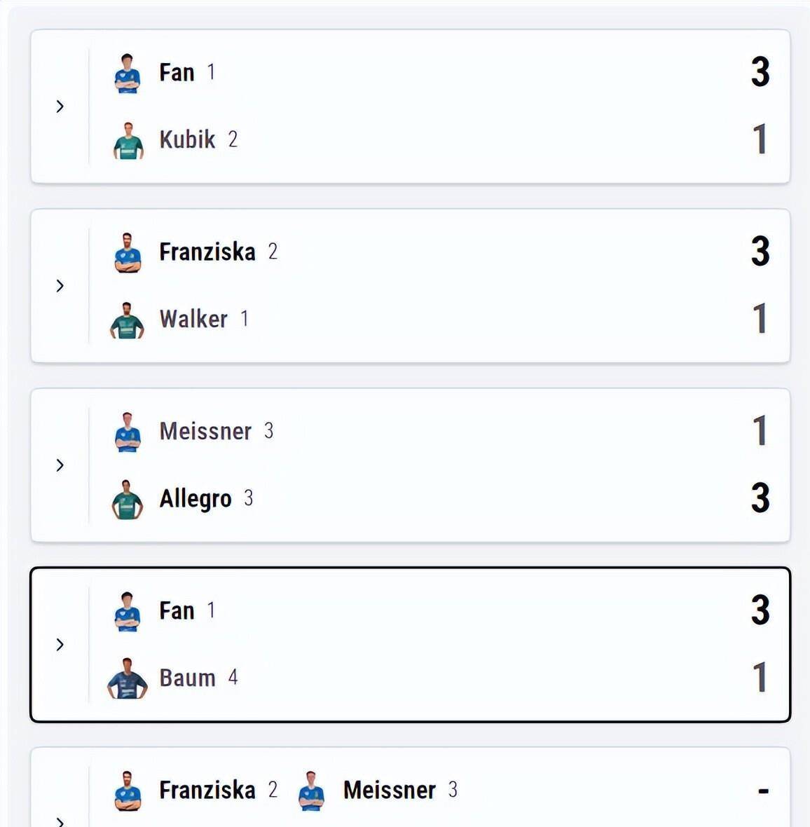 这场比赛的进程充满悬念。 第一盘樊振东以3-1击败库比克,比分为11-7、7-11、11-8、11-9。 随后队友弗朗西斯卡3-1战胜沃克,萨尔布吕肯以2-0领先。 第三盘迈斯纳1-3不敌阿莱格罗,格瑞扎将比分追至1-2。 此时第四盘成为关键战,格瑞扎教练组决定启用鲍姆替换原定选手沃克。